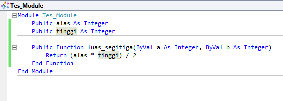 Nilai yang kita buat dalam module akan dengan mudah ditampilkan dalam form-form lainnya. Sehingga akan lebih cepat dalam menghasilkan sebuah nilai. Dan terlebih juga nilai/variabel yang telah kita buat pada module dapat dengan mudah dan leluasa untuk kita setting nilainya di form lain. Dengan begitu nilai tersebut dapat kita pakai secara bersamaan untuk form-form lainnya.