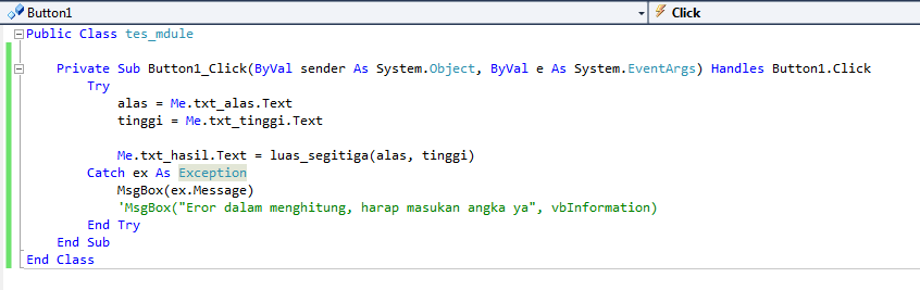 Untuk mengisi nilai hasil pada form, kita akan memanggil fungsi yang telah dibuat pada module kemudian mengsisikan nilainya sesuai dengan variable yang telah kita tentukan tadi.